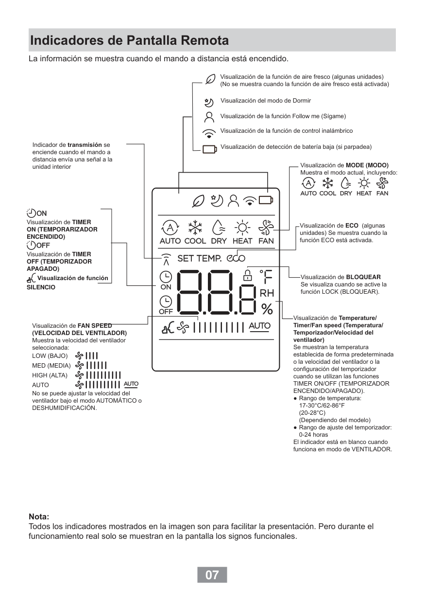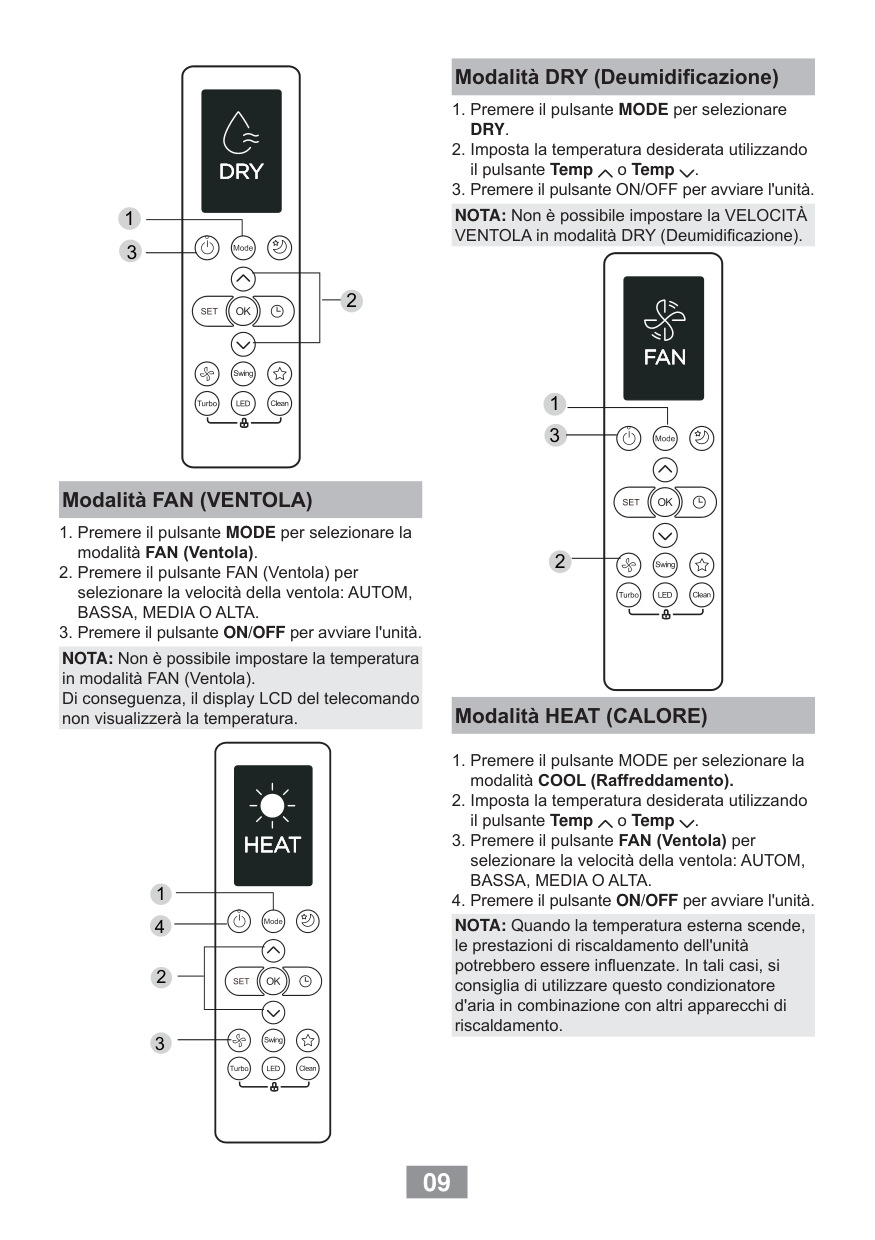In operation modes, the following functions are available: AUTO AUTOMATIC → COOL COOLING → DRY DEHUMIDIFICATION → HEATING HEATING → FAN ONLY