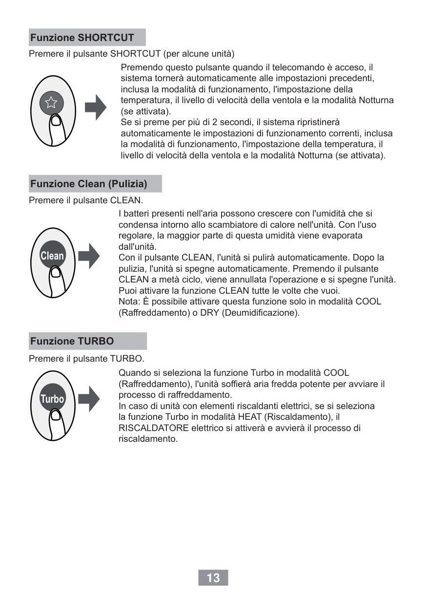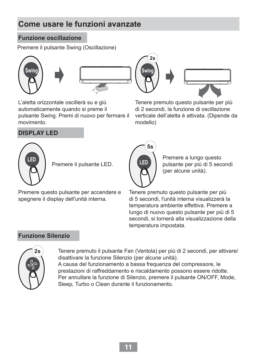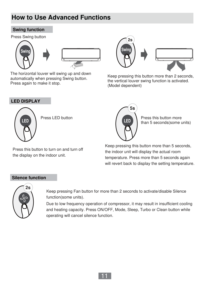 Hold down the Fan Speed button for more than 2 seconds to activate or disable the Silence function (available on some units). Due to the low-frequency operation of the compressor during Silence mode, cooling and heating capacity may be reduced. Pressing ON/OFF, Mode, Sleep, Turbo, or Clean during operation will cancel the Silence function. (Page 11/Page 28)