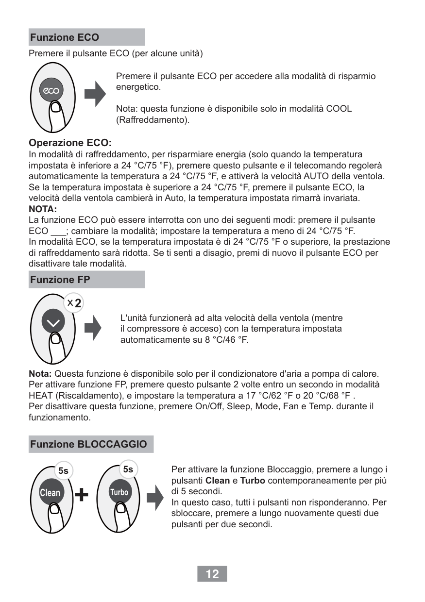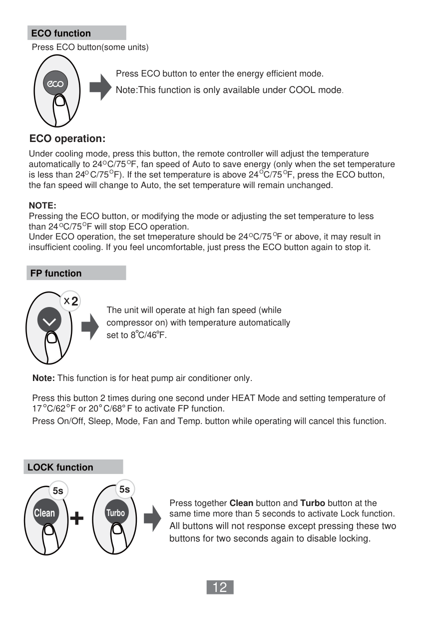 ECO mode is only available in COOL (cooling) mode. When activated and the set temperature is below 24°C (75°F), the remote controller will automatically adjust the temperature to 24°C (75°F) and set the fan speed to Auto to save energy. If the set temperature is already above 24°C (75°F), pressing ECO will only change the fan speed to Auto while leaving the temperature unchanged. (Page 12/Page 29)