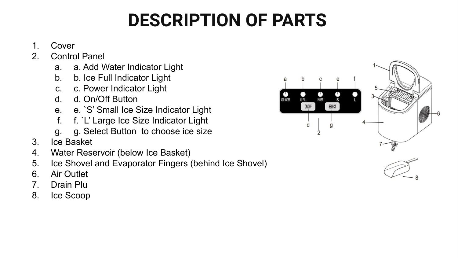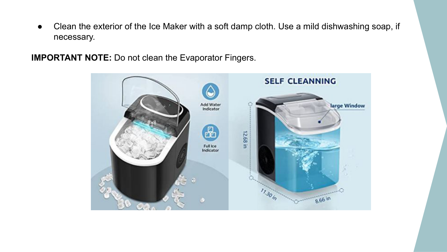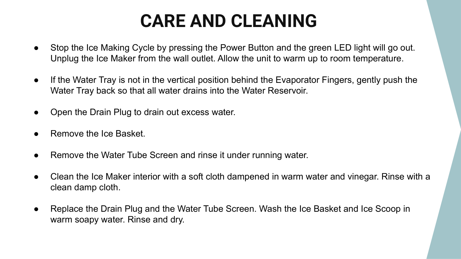 ● Stop the Ice Making Cycle by pressing the Power Button and the green LED light will go out. Unplug the Ice Maker from the wall outlet. Allow the unit to warm up to room temperature. ● If the Water Tray is not in the vertical position behind the Evaporator Fingers, gently push the Water Tray back so that all water drains into the Water Reservoir. ● Open the Drain Plug to drain out excess water. ● Remove the Ice Basket. ● Remove the Water Tube Screen and rinse it under running water. ● Clean the Ice Maker interior with a soft cloth dampened in warm water and vinegar. Rinse with a clean damp cloth. ● Replace the Drain Plug and the Water Tube Screen. Wash the Ice Basket and Ice Scoop in warm soapy water. Rinse and dry.● Clean the exterior of the Ice Maker with a soft damp cloth. Use a mild dishwashing soap, if necessary. IMPORTANT NOTE: Do not clean the Evaporator Fingers.