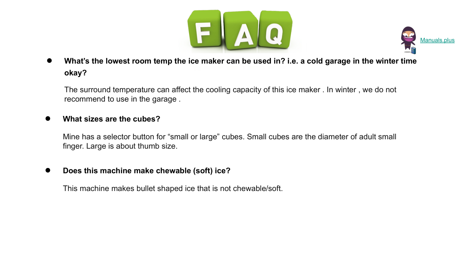 ● What’s the lowest room temp the ice maker can be used in? i.e. a cold garage in the winter time okay? The surround temperature can affect the cooling capacity of this ice maker . In winter , we do not recommend to use in the garage . Manuals.plus ● What sizes are the cubes? Mine has a selector button for “small or large” cubes. Small cubes are the diameter of adult small finger. Large is about thumb size. ● Does this machine make chewable (soft) ice? This machine makes bullet shaped ice that is not chewable/soft.
