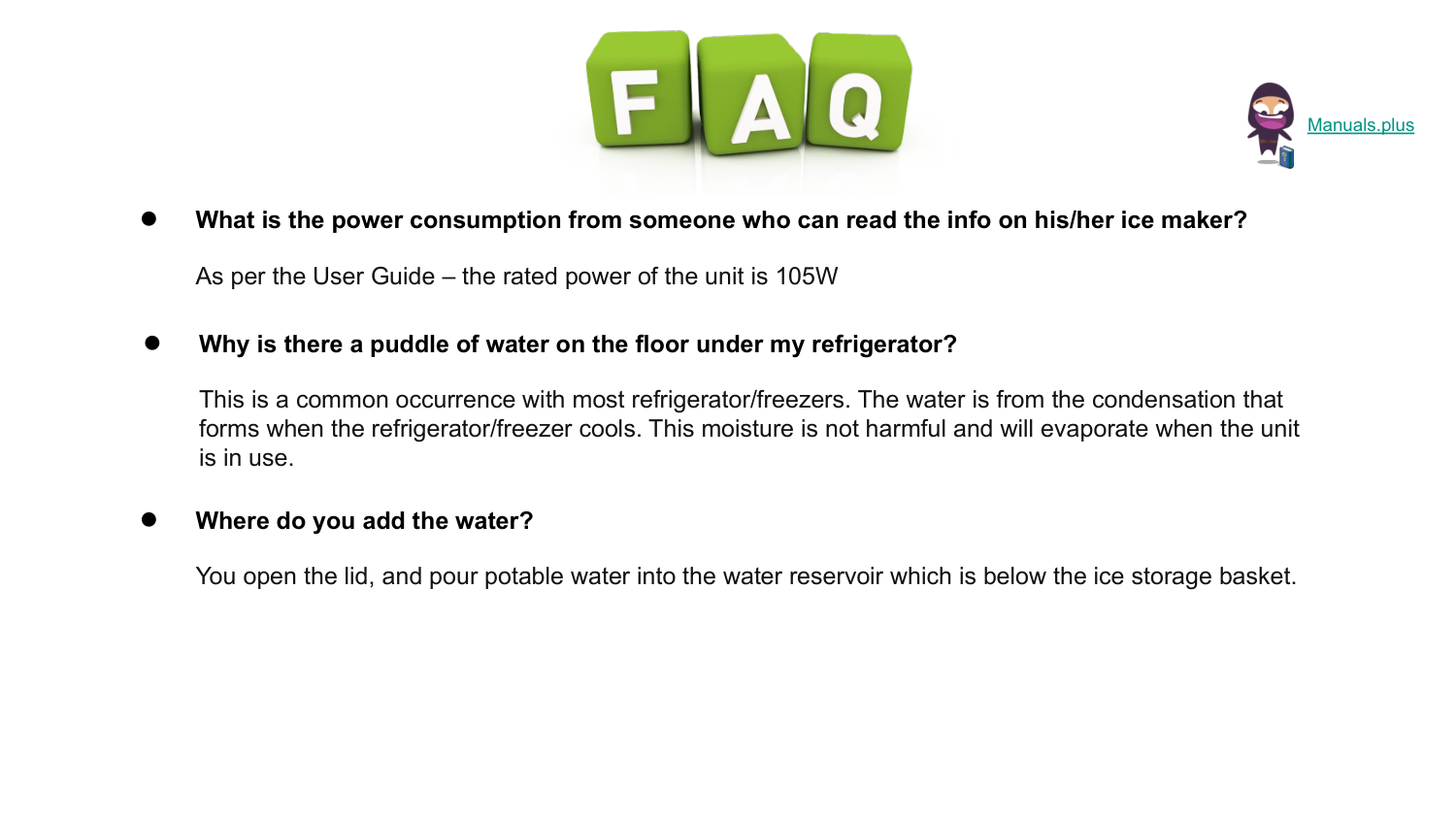 ● What is the power consumption from someone who can read the info on his/her ice maker? As per the User Guide – the rated power of the unit is 105W Manuals.plus ● Why is there a puddle of water on the floor under my refrigerator? This is a common occurrence with most refrigerator/freezers. The water is from the condensation that forms when the refrigerator/freezer cools. This moisture is not harmful and will evaporate when the unit is in use. ● Where do you add the water? You open the lid, and pour potable water into the water reservoir which is below the ice storage basket.