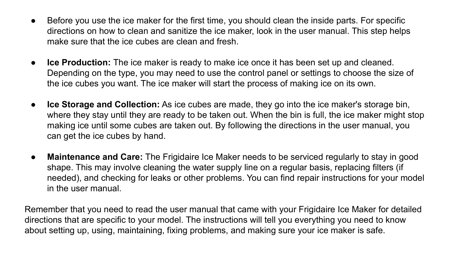 Introduction ● The Frigidaire Ice Maker is a helpful device that makes it easy and quick to make ice cubes. The Frigidaire Ice Maker is a safe way to make ice for drinks, parties, or every day use. Here's how to get started with the Frigidaire Ice Maker: ● Set up the ice maker by taking it out of its box and making sure that all of its parts are there. Put the ice maker on a stable, flat area near a power outlet. Make sure there is enough room around the ice maker to allow it to breathe. ● To make ice, the Frigidaire Ice Maker needs to be connected to a water source. Find the water inlet button on the back of the ice maker and use a water line to connect it to a source of water. Follow the directions from the manufacturer to connect the water line safely. ● Power Connection: Plug the Frigidaire Ice Maker's power line into an electrical outlet that is grounded. Make sure the outlet can handle the power needs of the ice maker. The ice maker should have a light or screen that lets you know it is working.