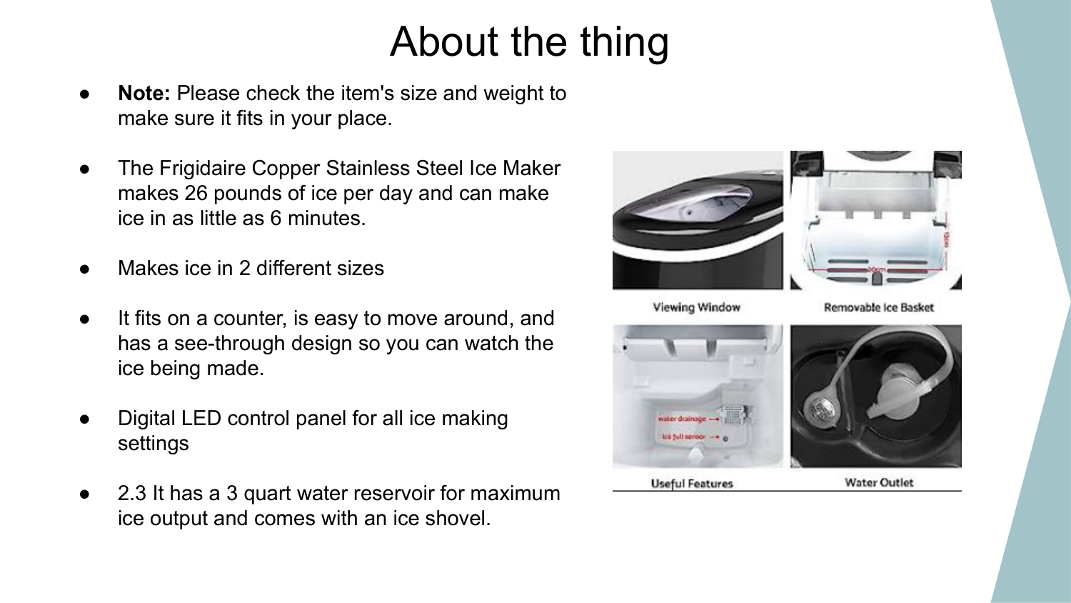 About the thing ● Note: Please check the item's size and weight to make sure it fits in your place. ● The Frigidaire Copper Stainless Steel Ice Maker makes 26 pounds of ice per day and can make ice in as little as 6 minutes. ● Makes ice in 2 different sizes ● It fits on a counter, is easy to move around, and has a see-through design so you can watch the ice being made. ● Digital LED control panel for all ice making settings ● 2.3 It has a 3 quart water reservoir for maximum ice output and comes with an ice shovel.