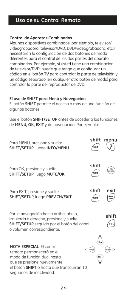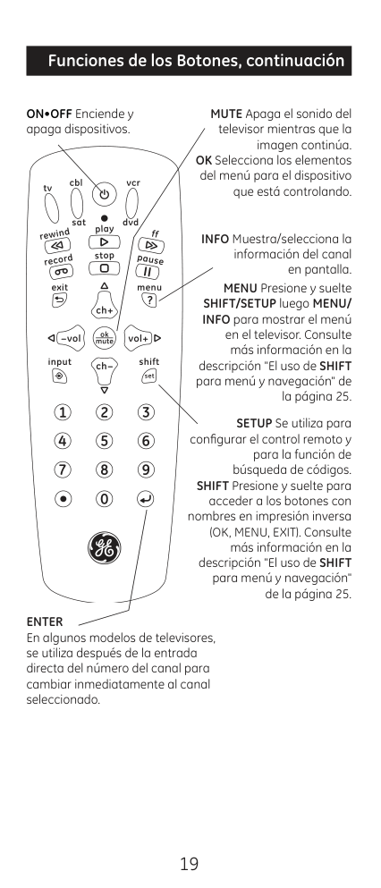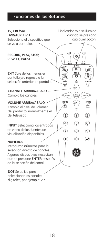 15 Felicitaciones por adquirir el control remoto universal GE. El control remoto universal GE es uno de los más fáciles de usar hoy en día. Con el control remoto universal GE, ¡el uso de varios controles remotos es cosa del pasado! Su control remoto universal GE controla varios dispositivos, incluidas las marcas más populares de televisores, DVR, DVD, cable y satélite. El control remoto universal GE es fácil de usar, fácil de programar y le da control total: ¡con el simple toque de sus dedos!
