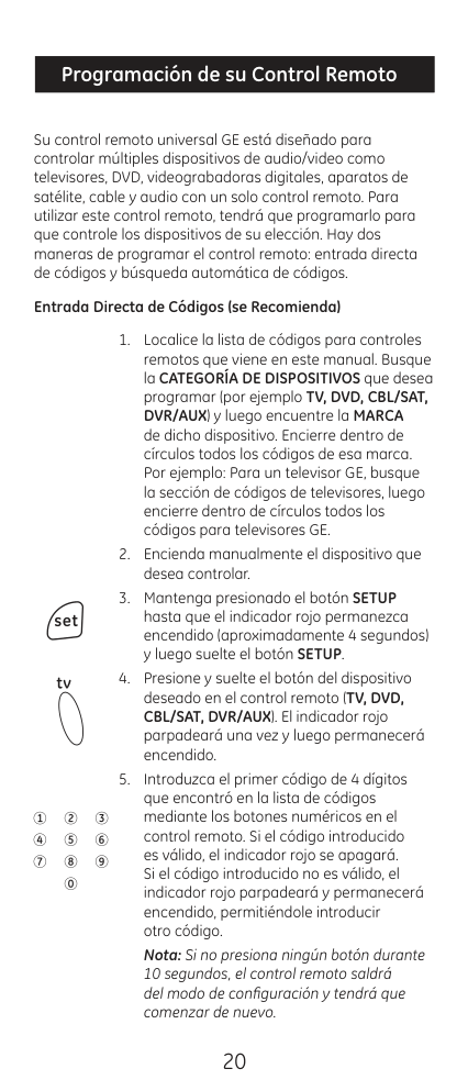 Programación de su Control Remoto Su control remoto universal GE está diseñado para controlar múltiples dispositivos de audio/video como televisores, DVD, videograbadoras digitales, aparatos de satélite, cable y audio con un solo control remoto. Para utilizar este control remoto, tendrá que programarlo para que controle los dispositivos de su elección. Hay dos maneras de programar el control remoto: entrada directa de códigos y búsqueda automática de códigos.