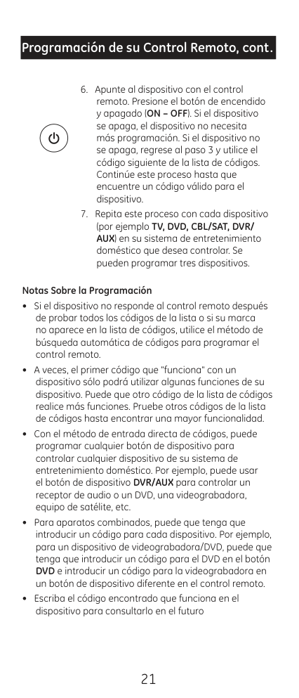 21 Programación de su Control Remoto, cont.