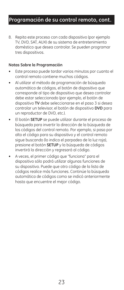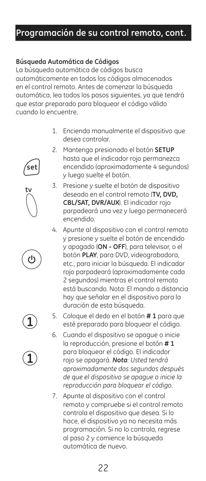 22 Programación de su control remoto, cont. Búsqueda Automática de Códigos La búsqueda automática de códigos busca automáticamente en todos los códigos almacenados en el control remoto. Antes de comenzar la búsqueda automática, lea todos los pasos siguientes, ya que tendrá que estar preparado para bloquear el código válido cuando lo encuentre.