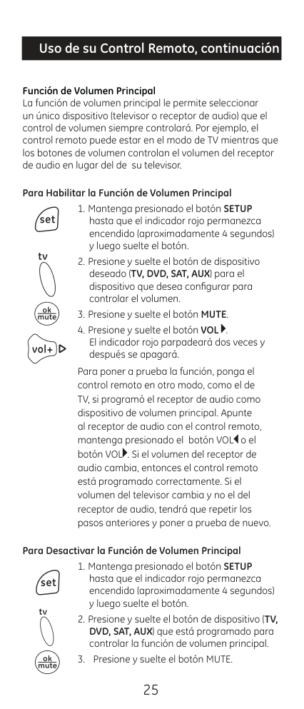 24 Función de Volumen Principal La función de volumen principal le permite seleccionar un único dispositivo (televisor o receptor de audio) que el control de volumen siempre controlará. Por ejemplo, el control remoto puede estar en el modo de TV mientras que los botones de volumen controlan el volumen del receptor de audio en lugar del de su televisor. Para Habilitar la Función de Volumen Principal