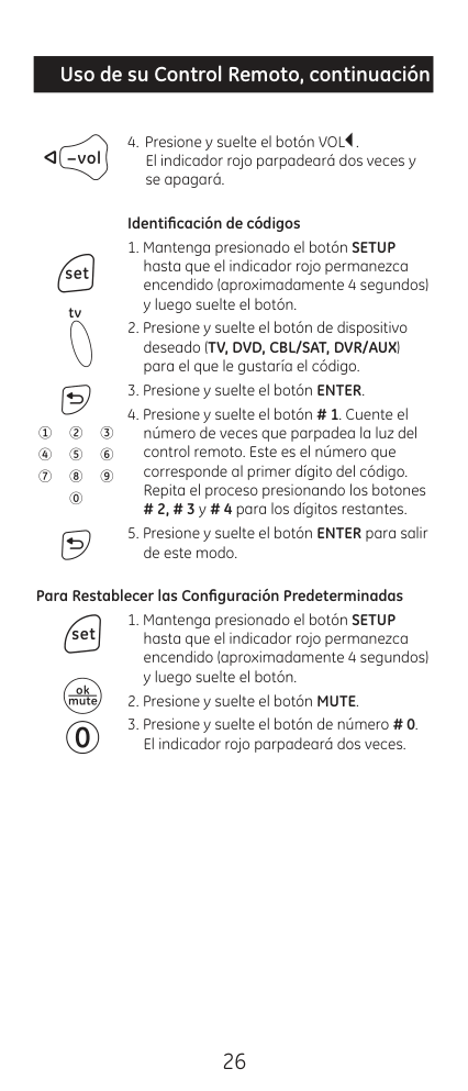 Nota: Si no presiona ningún botón durante 10 segundos, el control remoto saldrá del modo de configuración y tendrá que comenzar de nuevo.