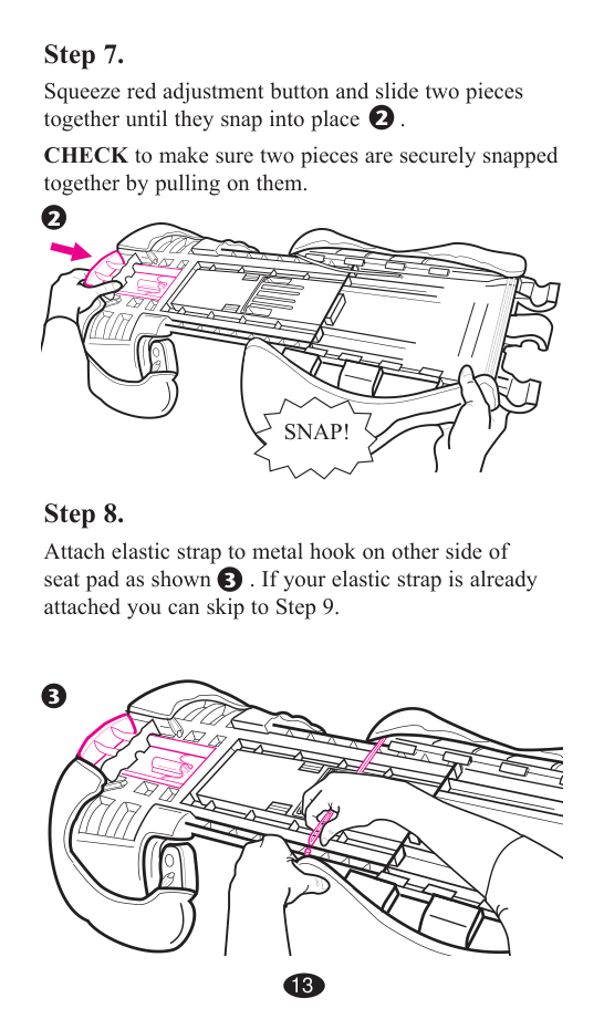 con respaldo, siga con el Paso 6.Montar el respaldo (en ciertos modelos) Paso 6a. De la vuelta al apoyacabezas y respaldo como se indica . 1 1 Paso 6. En ciertos modelos, es posible que la almohadilla inferior del respaldo no esté sujeta al respaldo. Coloque la almohadilla inferior del respaldo alrededor de los bordes de apoyo, como indica la figura. Luego ajuste la correa elástica inferior al gancho de metal que está en el lado opuesto de la almohadilla del asiento. Si ya sujetó la almohadilla del respaldo, diríjase al Paso 6a. 12