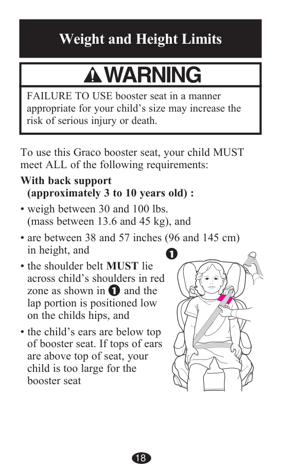 18 NO USAR el asiento para niños de manera apropiada para el tamaño de su niño podrá aumentar el riesgo de lesiones graves o la muerte. Límites de altura y peso Para usar este asiento para niños de Graco, su niño DEBE cumplir con TODOS los requisitos siguientes: Con respaldo (de 3 a 10 años, aproximadamente): o debe pesar entre 30 y 100 libras (13.6 y 45 kg), y medir entre 38 y 57 pulgadas (96 y 145 cm) de altura, y el cinturón de hombro DEBE cruzar los hombros del niño en la zona roja como se indica en y la parte de regazo debe quedar en la parte inferior de las caderas del niño, y las orejas del niño deben quedar por debajo de la parte superior del asiento para niños. Si la parte superior de las orejas queda por encima de la parte superior de la silla, su niño es demasiado grande para el asiento para niños. 1 1