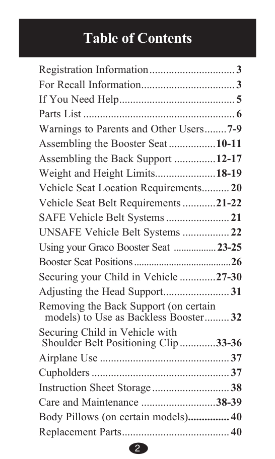 Using your Graco Booster Seat .................23-25