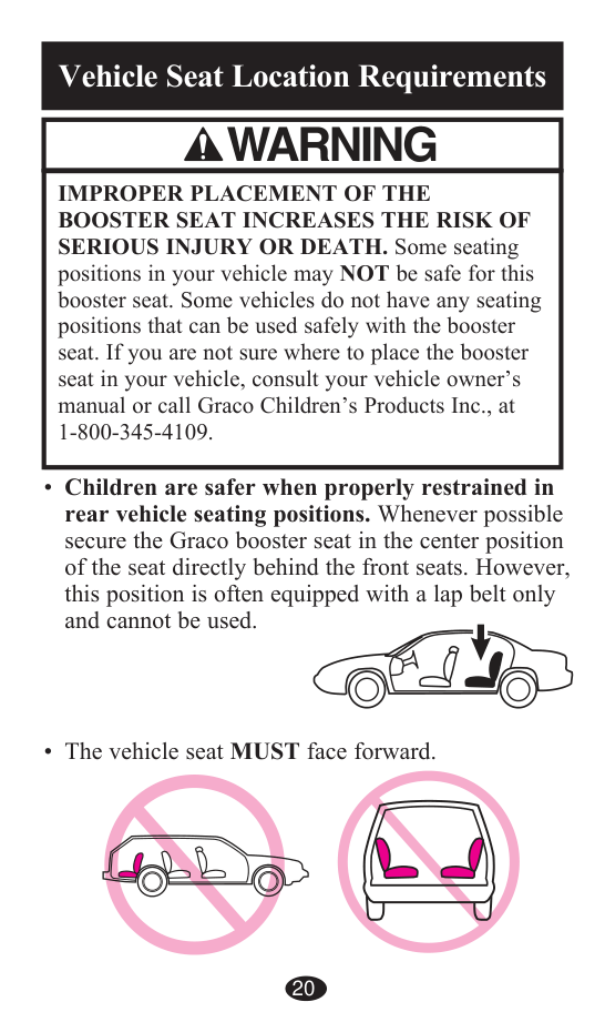Children are safer when properly restrained in rear vehicle seating positions. Whenever possible, secure the Graco booster seat in the center position of the seat directly behind the front seats. However, this position is often equipped with a lap belt only and cannot be used. The vehicle seat must face forward. Never place the booster seat in a vehicle seating location that has an air bag.