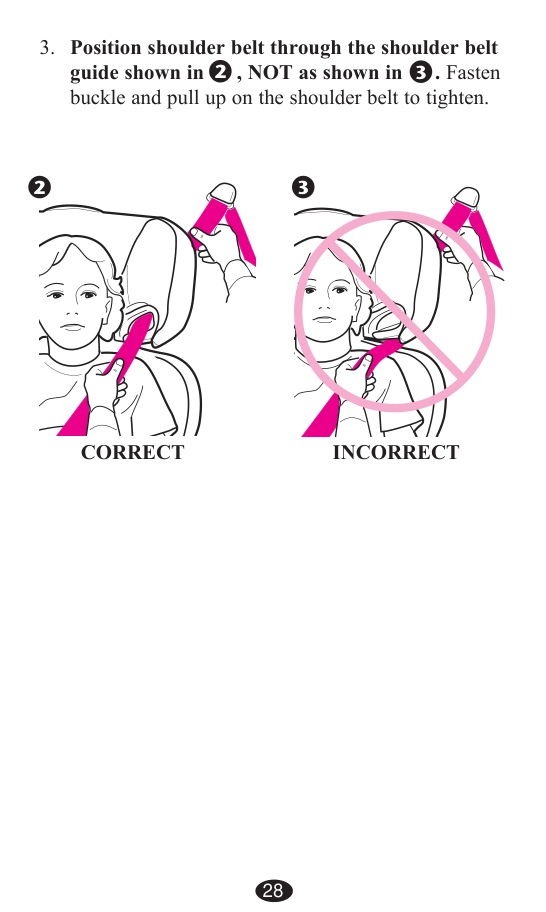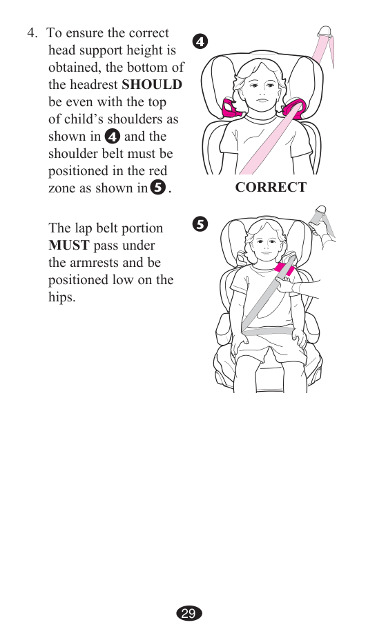 Place the booster seat firmly against the back of a forward-facing vehicle seat equipped with a lap/shoulder belt. Have your child sit with their back flat against the back of the booster seat. Position the shoulder belt through the shoulder belt guide (not over it), fasten the buckle, and pull up to tighten. The bottom of the headrest should be even with the top of your child's shoulders, and the lap belt must pass under the armrests and be positioned low on the hips. Make sure vehicle belts lie flat and are not twisted.