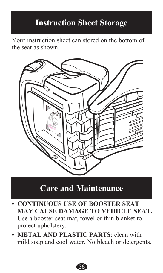 Límpielas con un jabón suave y agua fría. No use blanqueador ni detergentes. Cuidado y mantenimiento 38 Almacenaje de la hoja de instrucciones Se puede guardar su hoja de instrucciones en el fondo del asiento como se indica.Para quitar la funda del asiento