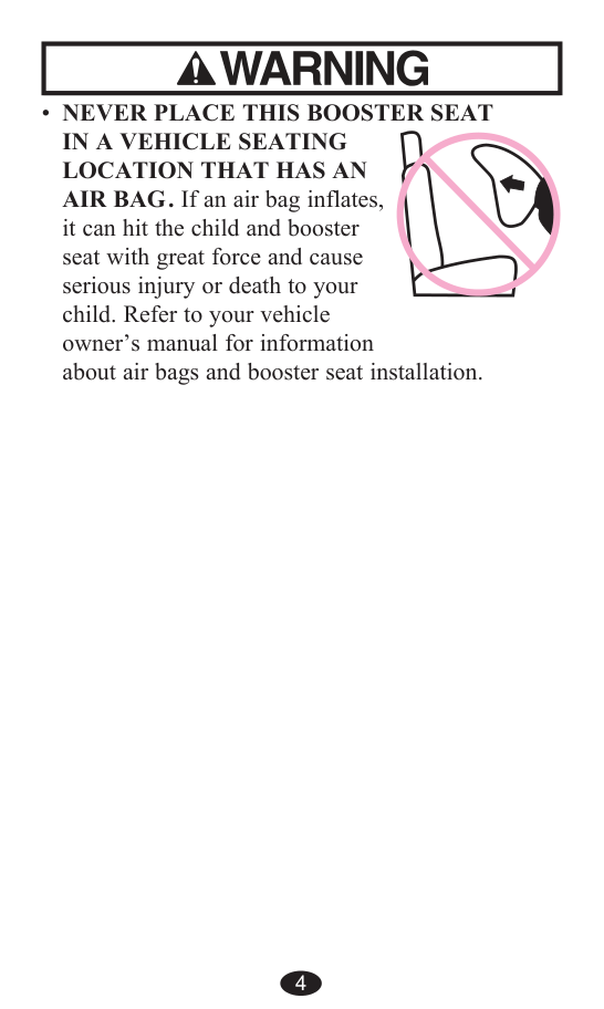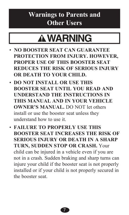 OWNER’S MANUAL. DO NOT let others install or use the booster seat unless they understand how to use it. Failure To Properly Use This
