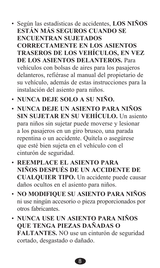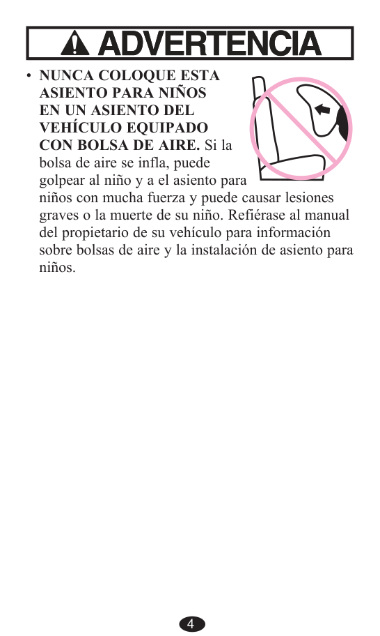 DE LOS ASIENTOS DELANTEROS. Para vehículos con bolsas de aires para los pasajeros delanteros, refiérase al manual del propietario de su vehículo, además de estas instrucciones para la instalación del asiento para niños. Nunca Deje Solo A Su Niño.