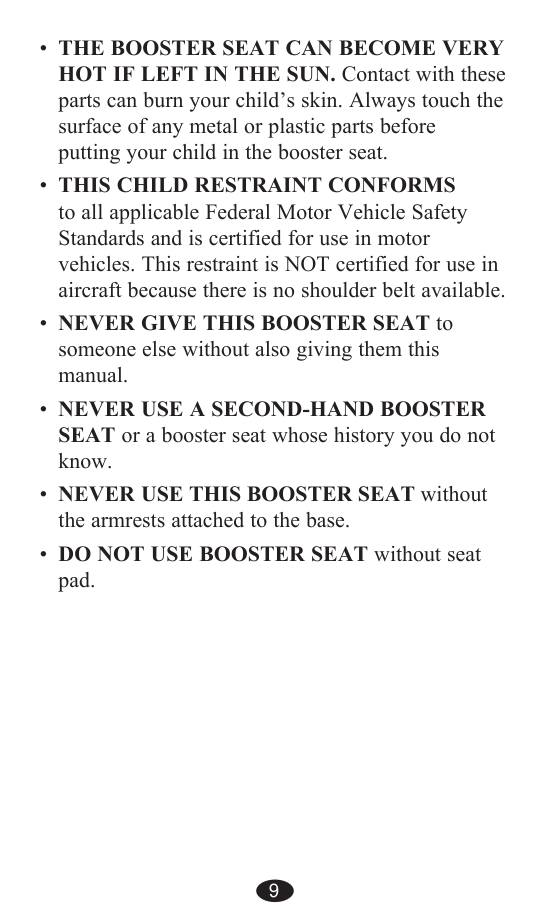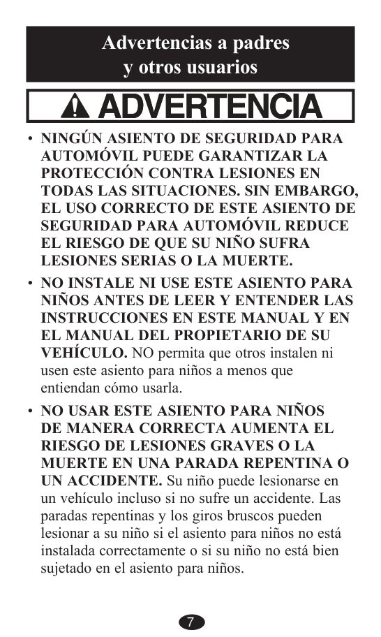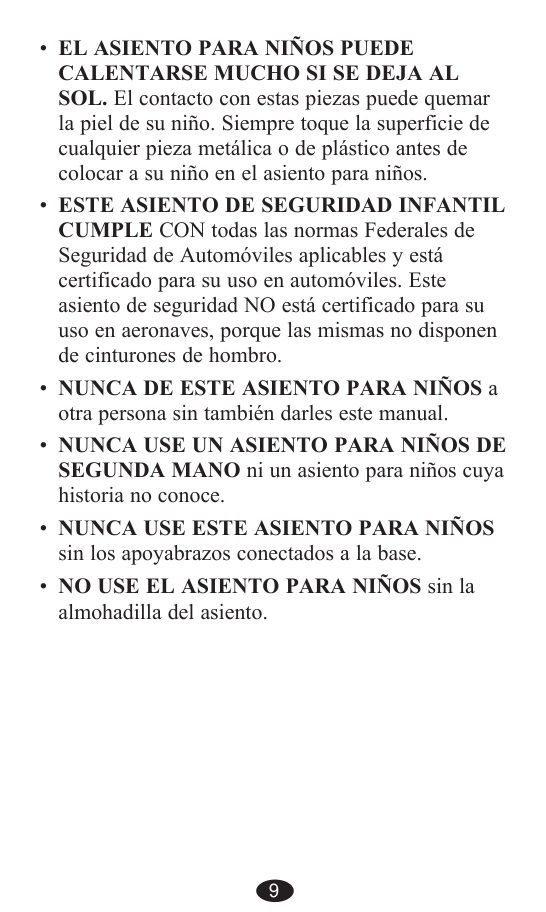 CUMPLE CON todas las normas Federales de Seguridad de Automóviles aplicables y está certificado para su uso en automóviles. Este asiento de seguridad NO está certificado para su uso en aeronaves, porque las mismas no disponen de cinturones de hombro. NUNCA DE ESTE ASIENTO PARA NIÑOS a otra persona sin también darles este manual. Nunca Use Un Asiento Para Niños De