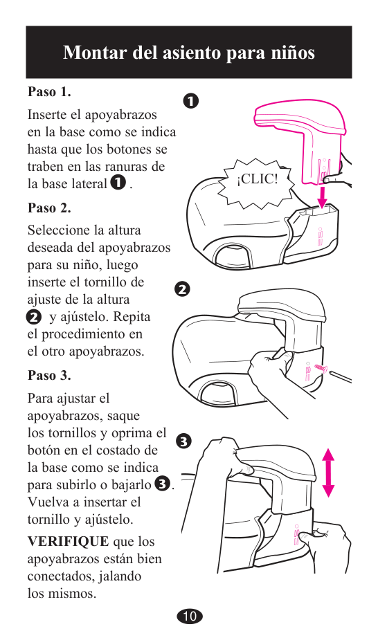 sin los apoyabrazos conectados a la base. NO USE EL ASIENTO PARA NIÑOS sin la almohadilla del asiento.10 Montar del asiento para niños Paso 1. Inserte el apoyabrazos en la base como se indica hasta que los botones se traben en las ranuras de la base lateral . Paso 2. Seleccione la altura deseada del apoyabrazos para su niño, luego inserte el tornillo de ajuste de la altura y ajústelo. Repita el procedimiento en el otro apoyabrazos. Paso 3. Para ajustar el apoyabrazos, saque los tornillos y oprima el botón en el costado de la base como se indica para subirlo o bajarlo . Vuelva a insertar el tornillo y ajústelo. VERIFIQUE que los apoyabrazos están bien conectados, jalando los mismos.