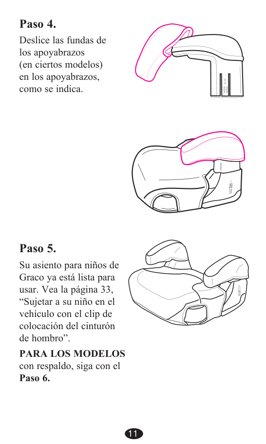 1 1 2 2 3 311 Paso 4. Deslice las fundas de los apoyabrazos (en ciertos modelos) en los apoyabrazos, como se indica. Paso 5. Su asiento para niños de Graco ya está lista para usar. Vea la página 33, “Sujetar a su niño en el vehículo con el clip de colocación del cinturón de hombro”.