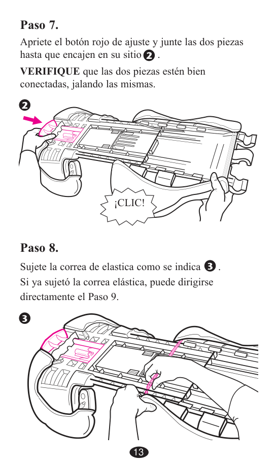 13 Paso 7. Apriete el botón rojo de ajuste y junte las dos piezas hasta que encajen en su sitio . VERIFIQUE que las dos piezas estén bien conectadas, jalando las mismas.