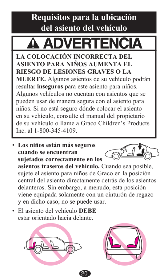 Los niños están más seguros cuando se encuentran sujetados correctamente en los asientos traseros del vehículo. Cuando sea posible, sujete el asiento para niños de Graco en la posición central del asiento directamente detrás de los asientos delanteros. Sin embargo, a menudo, esta posición viene equipada solamente con un cinturón de regazo y en dicho caso, no se puede usar. El asiento del vehículo DEBE estar orientado hacia delante. 20