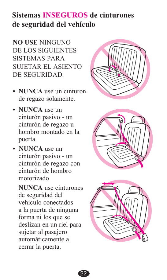 PARA NIÑOS, SI la posición del asiento cumple con todos los demás requisitos de estas instrucciones y las del manual del propietario de su vehículo. Sistemas SEGUROS de cinturones de seguridad del vehículo 21 NUNCA use un cinturón pasivo - un cinturón de regazo u hombro montado en la puerta NUNCA use un cinturón pasivo - un cinturón de regazo con cinturón de hombro motorizado NUNCA use cinturones de seguridad del vehículo conectados a la puerta de ninguna forma ni los que se deslizan en un riel para sujetar al pasajero automáticamente al cerrar la puerta. 22
