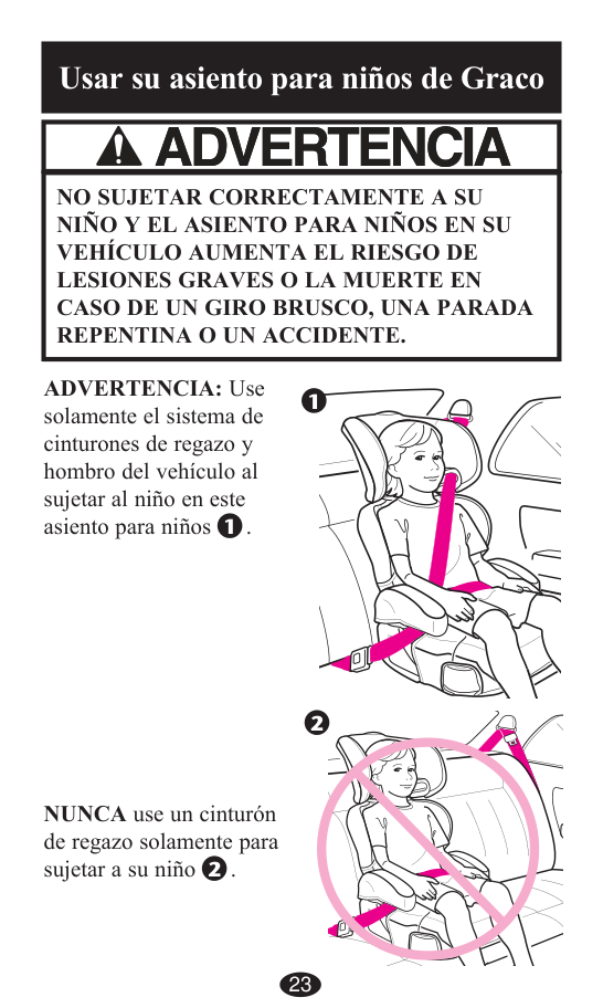 NUNCA use un cinturón de regazo solamente. Sistemas INSEGUROS de cinturones de seguridad del vehículoUsar su asiento para niños de Graco ADVERTENCIA: Use solamente el sistema de cinturones de regazo y hombro del vehículo al sujetar al niño en este asiento para niños . NUNCA use un cinturón de regazo solamente para sujetar a su niño .
