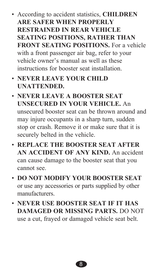 TURN, SUDDEN STOP OR CRASH. Your child can be injured in a vehicle even if you are not in a crash. Sudden braking and sharp turns can injure your child if the booster seat is not properly installed or if your child is not properly secured in the booster seat.8 According to accident statistics, CHILDREN