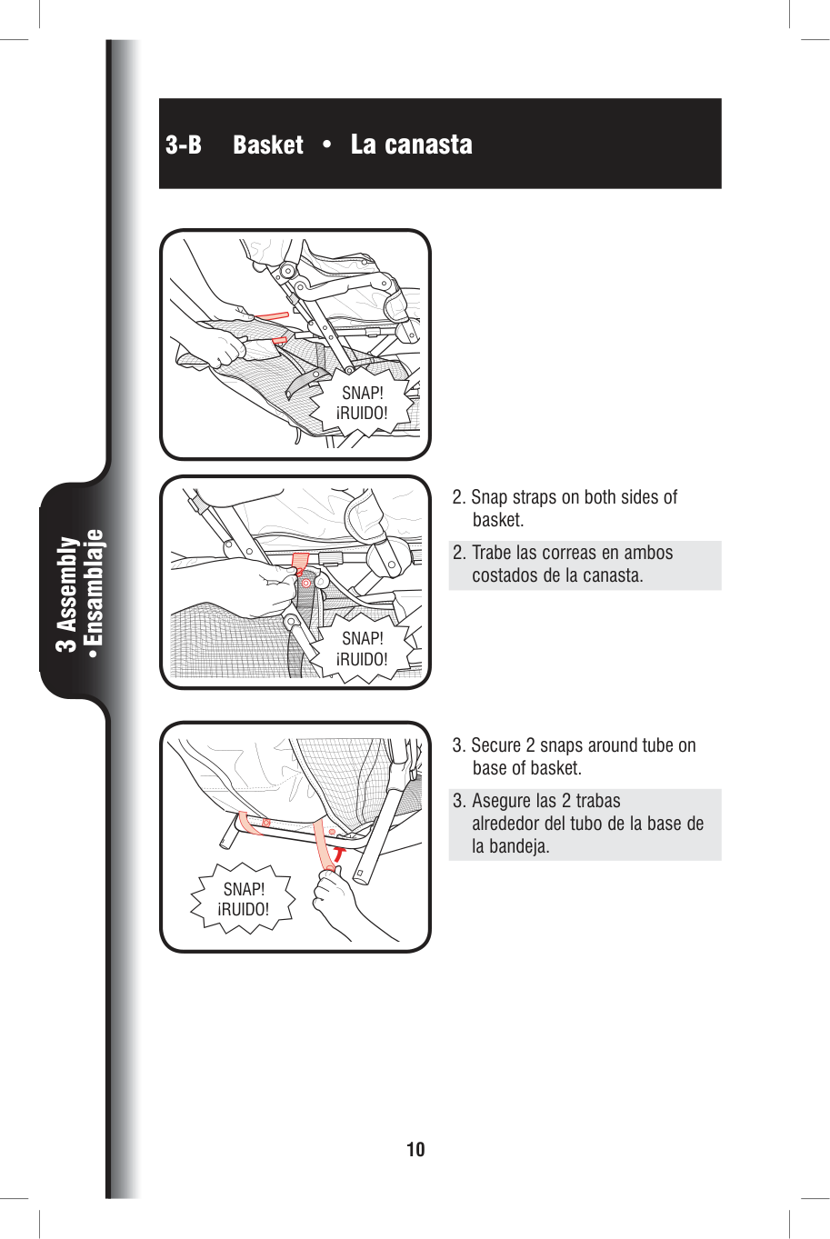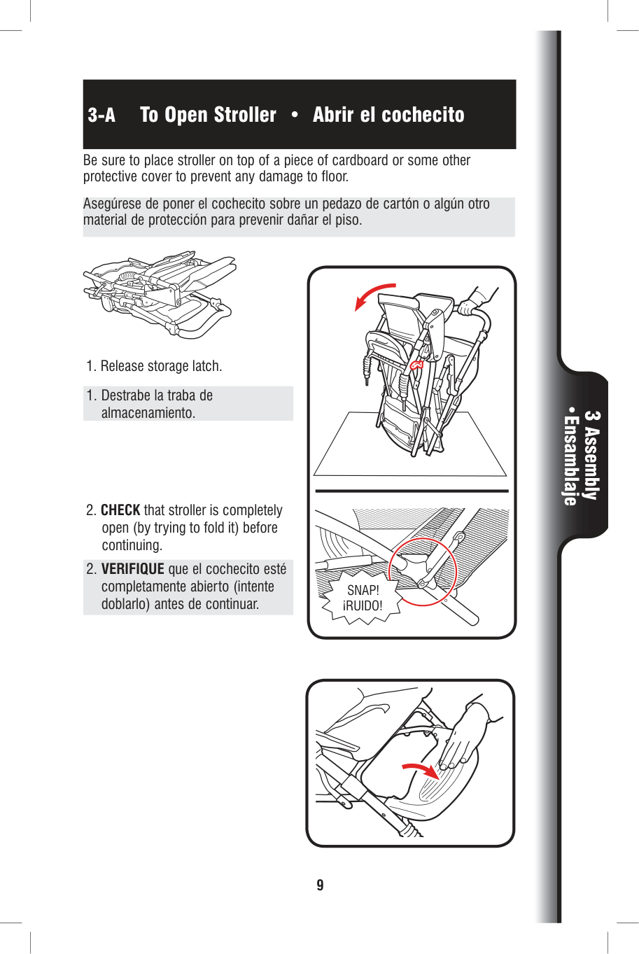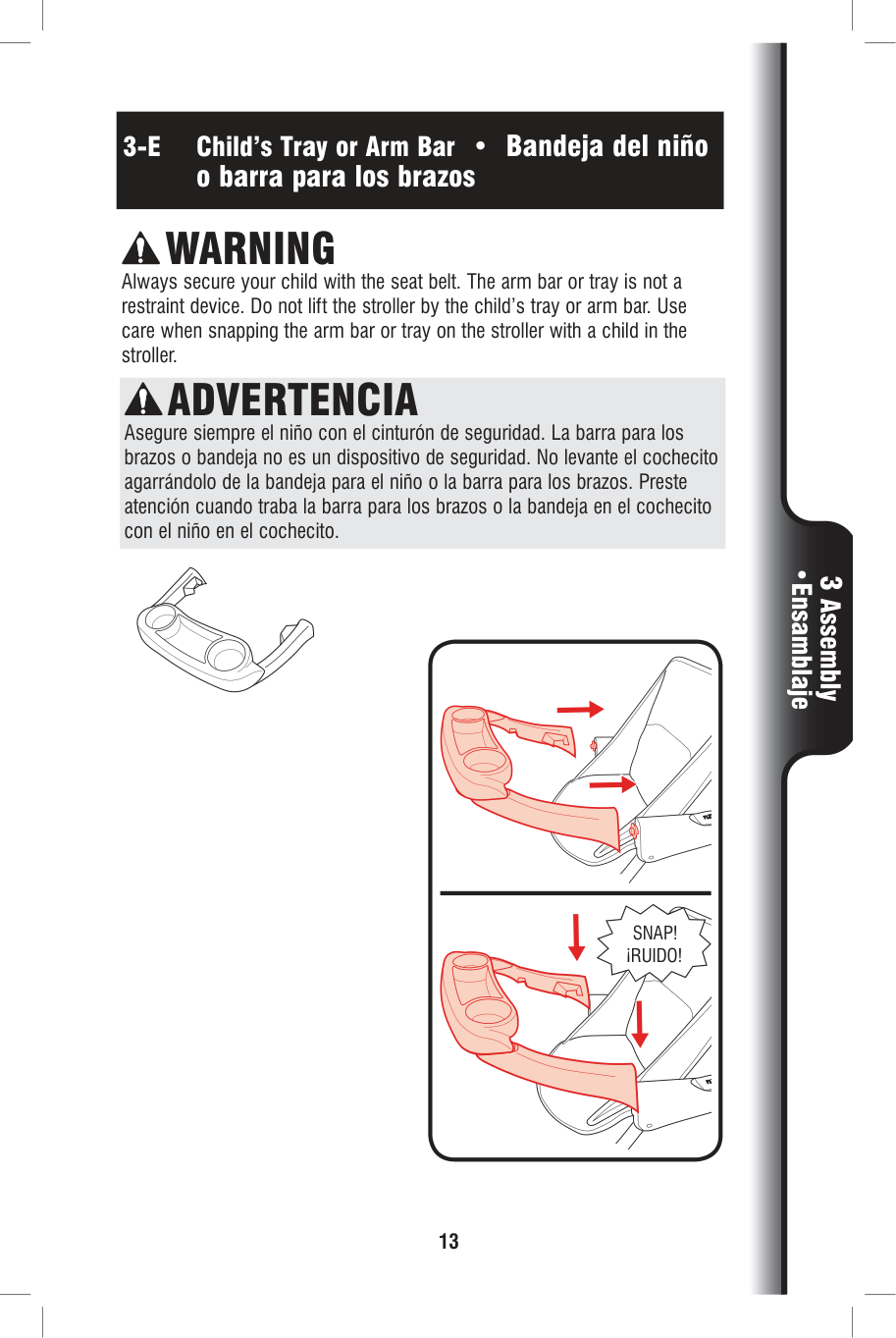 Asegure siempre el niño con el cinturón de seguridad. La barra para los brazos o bandeja no es un dispositivo de seguridad. No levante el cochecito agarrándolo de la bandeja para el niño o la barra para los brazos. Preste atención cuando traba la barra para los brazos o la bandeja en el cochecito con el niño en el cochecito.Snap!