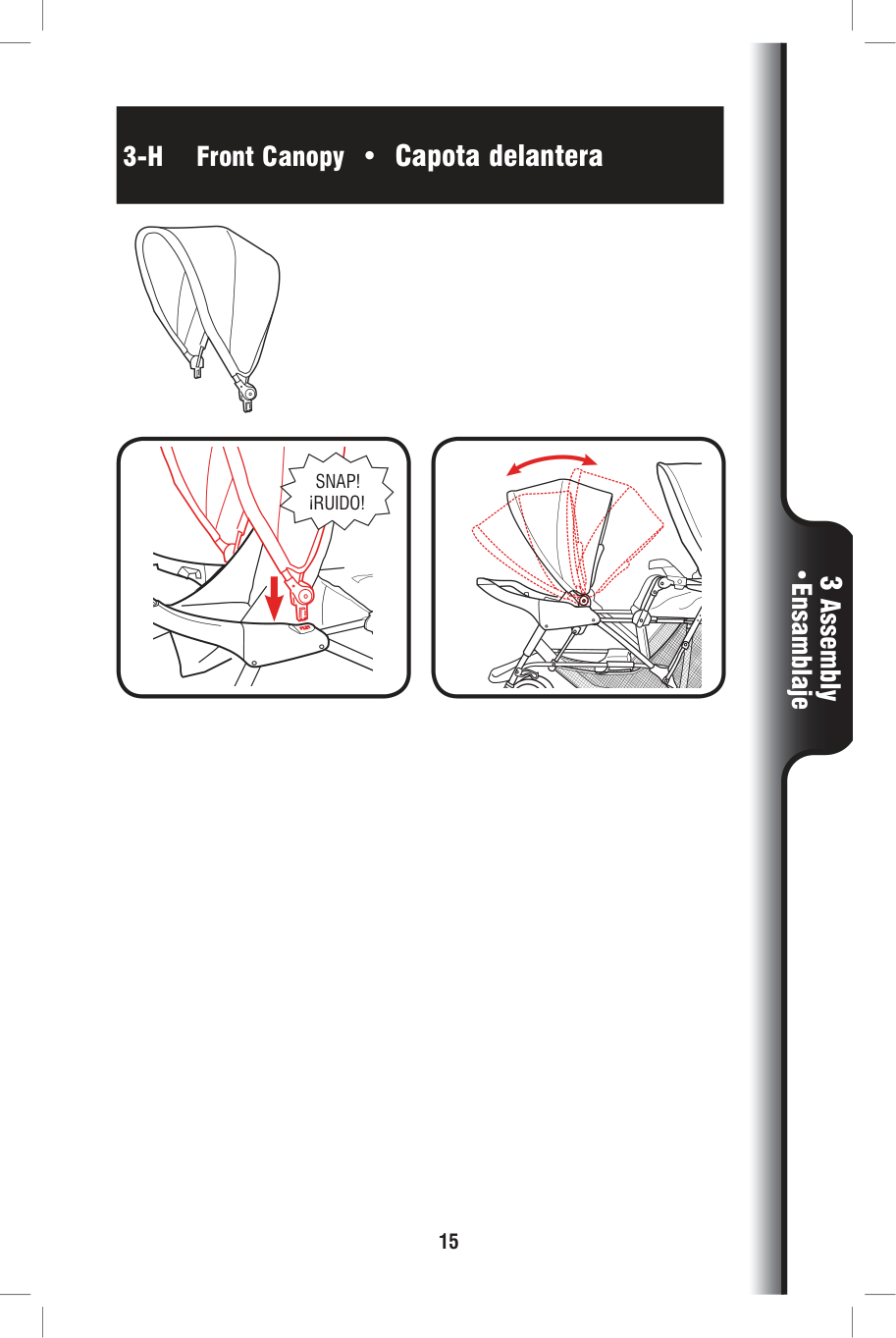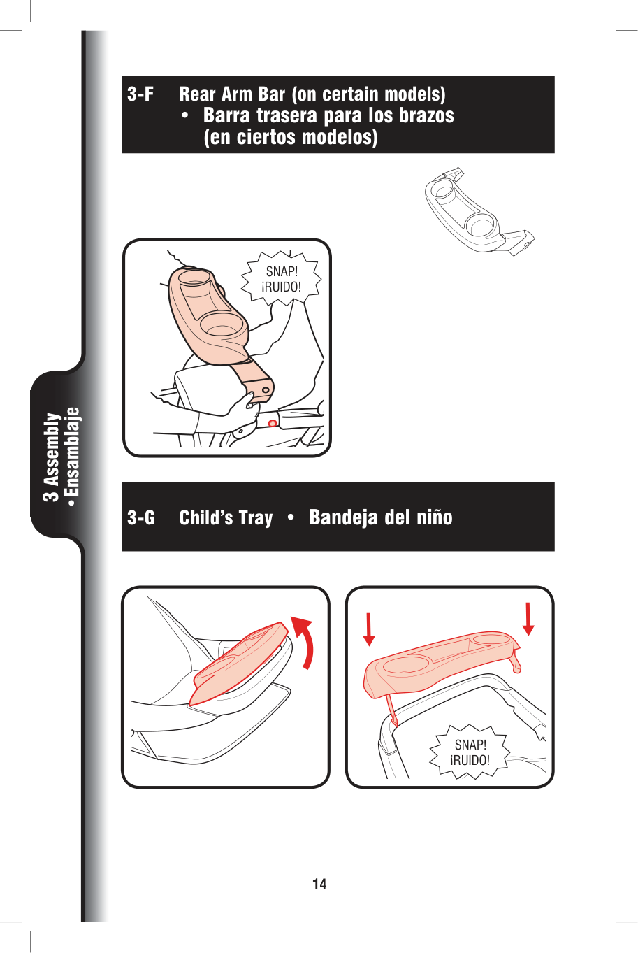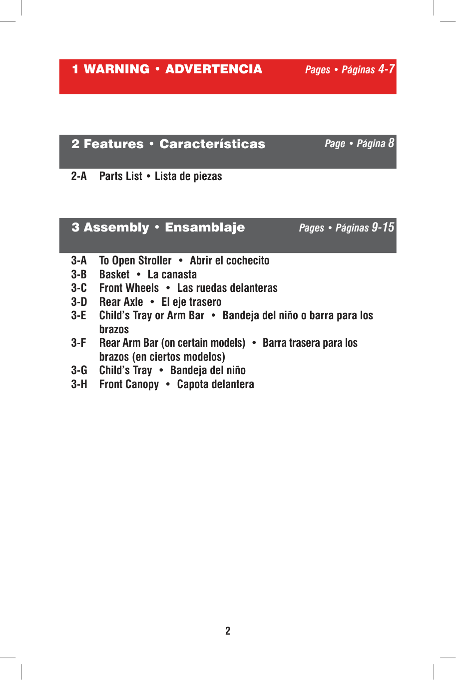 Rear Arm Bar (on certain models) • Barra trasera para los .brazos (en ciertos modelos) 3-G Child’s Tray • Bandeja del niño 3-H Front Canopy • Capota delantera 3 Assembly • Ensamblaje Pages • Páginas 9-15 Page • Página 8