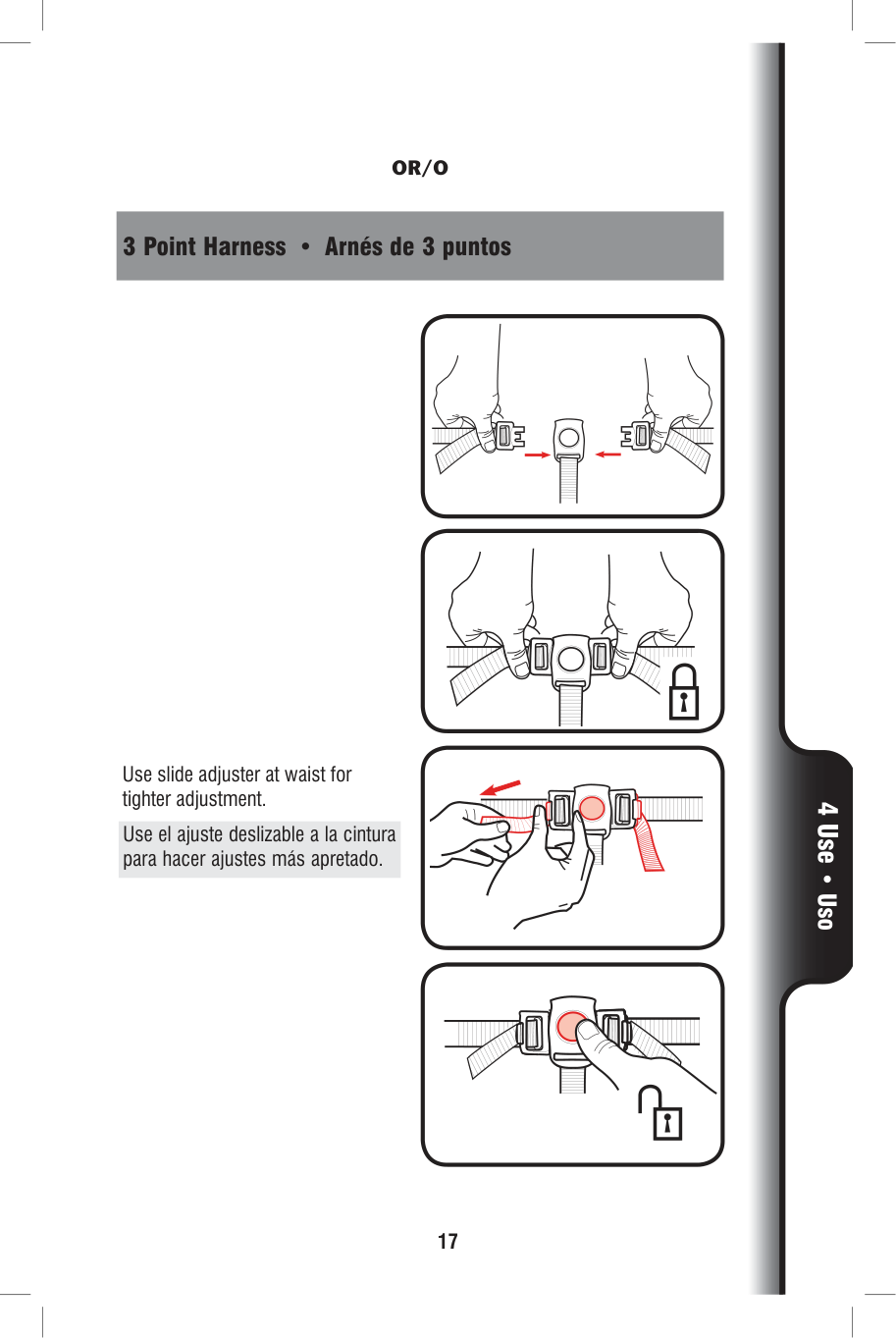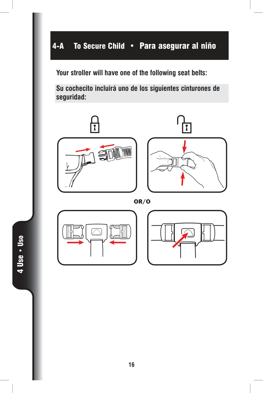 To Secure Child • Para asegurar al niño Your stroller will have one of the following seat belts: Su cochecito incluirá uno de los siguientes cinturones de seguridad:Or/O