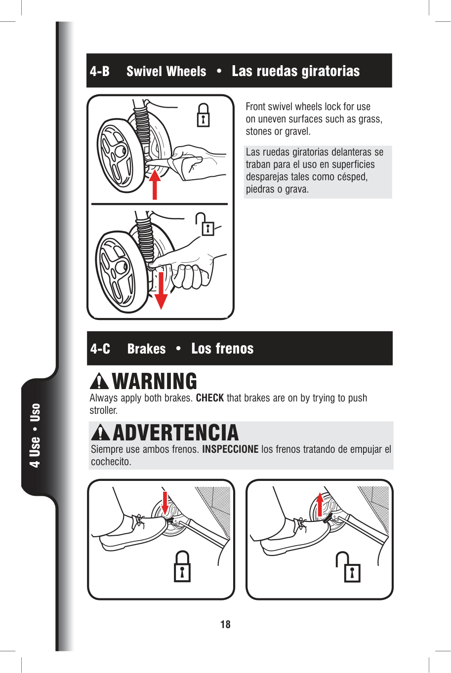 Siempre use ambos frenos. INSPECCIONE los frenos tratando de empujar el cochecito.4-B