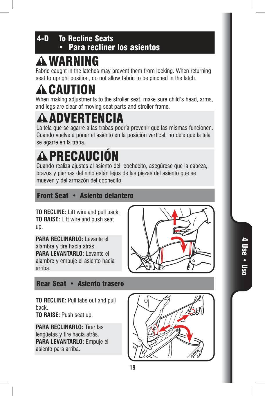When making adjustments to the stroller seat, make sure child’s head, arms, and legs are clear of moving seat parts and stroller frame.Precaución