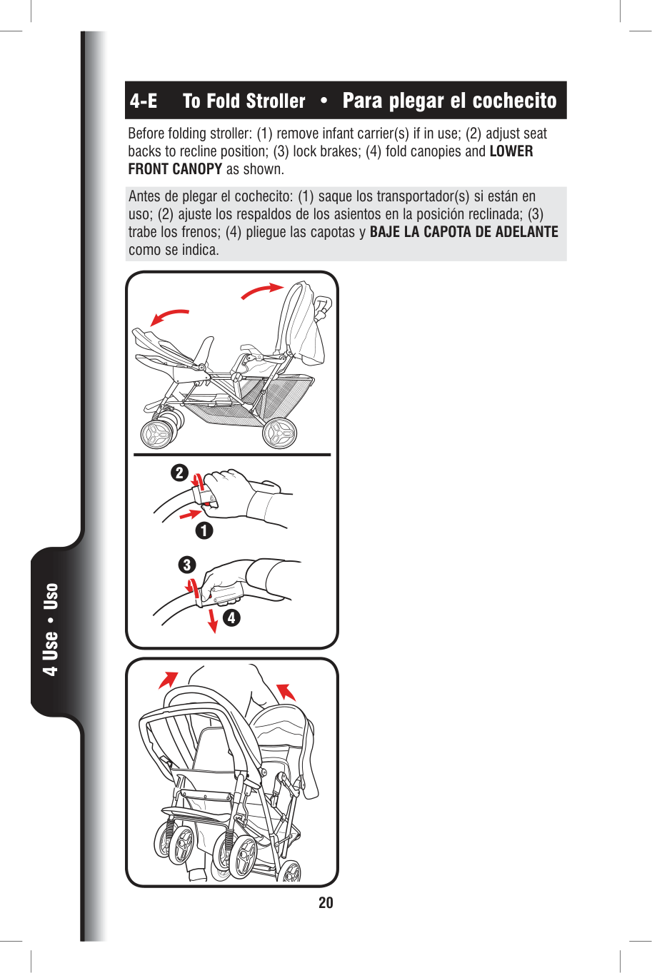 To Fold Stroller • Para plegar el cochecito Before folding stroller: (1) remove infant carrier(s) if in use; (2) adjust seat backs to recline position; (3) lock brakes; (4) fold canopies and LOWER FRONT CANOPY as shown. Antes de plegar el cochecito: (1) saque los transportador(s) si están en uso; (2) ajuste los respaldos de los asientos en la posición reclinada; (3) trabe los frenos; (4) pliegue las capotas y BAJE LA CAPOTA DE ADELANTE como se indica. 1 2 3 421