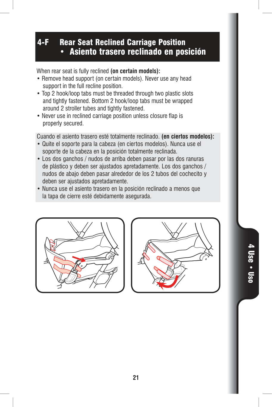 Cuando realiza ajustes al asiento del cochecito, asegúrese que la cabeza, brazos y piernas del niño están lejos de las piezas del asiento que se mueven y del armazón del cochecito. Front Seat • Asiento delantero TO RECLINE: Pull tabs out and pull back. TO RAISE: Push seat up. PARA RECLINARLO: Tirar las lengüetas y tire hacia atrás. PARA LEVANTARLO: Empuje el asiento para arriba. Rear Seat • Asiento trasero20
