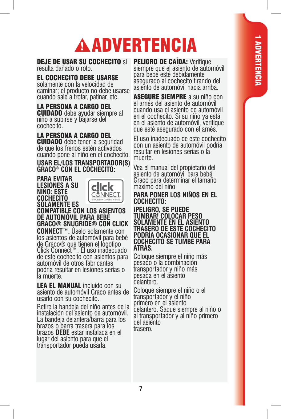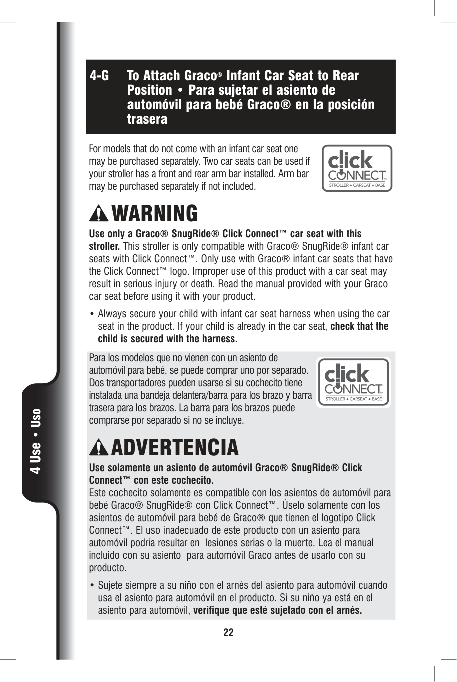 Use solamente un asiento de automóvil Graco® SnugRide® Click Connect™ con este cochecito. Este cochecito solamente es compatible con los asientos de automóvil para bebé Graco® SnugRide® con Click Connect™. Úselo solamente con los asientos de automóvil para bebé de Graco® que tienen el logotipo Click Connect™. El uso inadecuado de este producto con un asiento para automóvil podría resultar en lesiones serias o la muerte. Lea el manual incluido con su asiento para automóvil Graco antes de usarlo con su producto.23