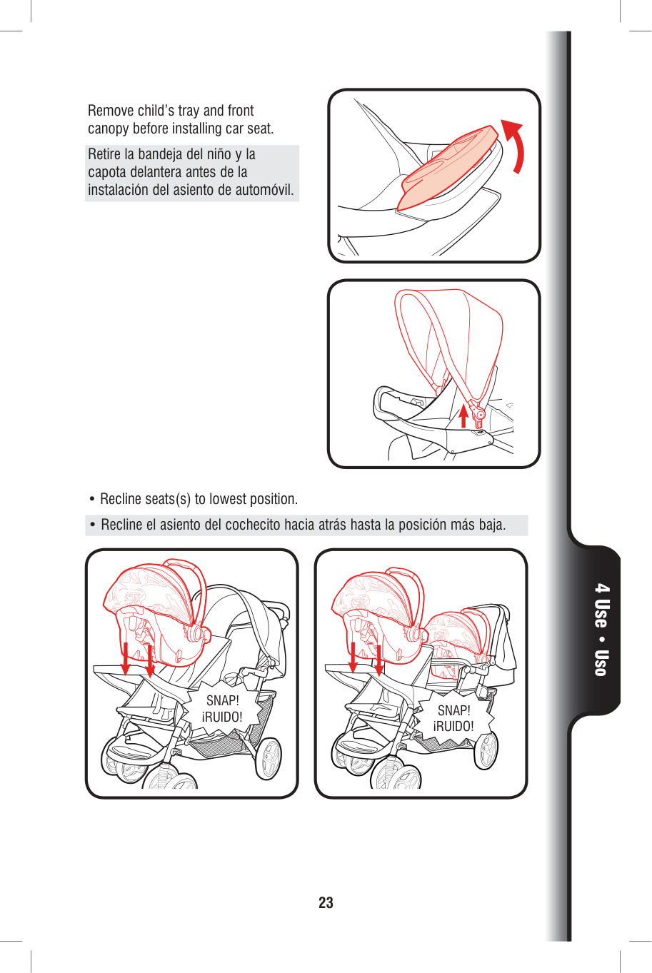 Remove child’s tray and front canopy before installing car seat. Retire la bandeja del niño y la capota delantera antes de la instalación del asiento de automóvil.24