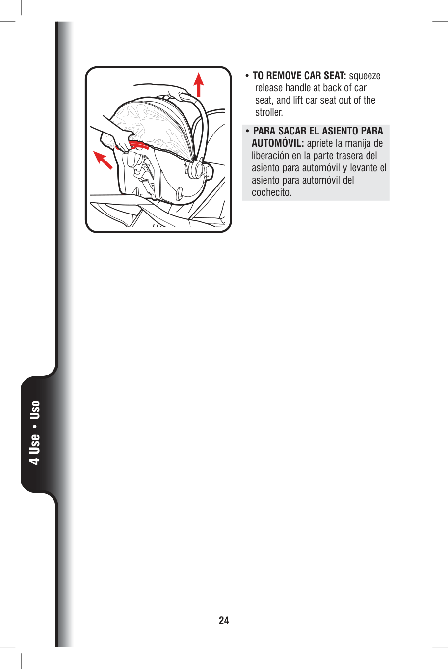AUTOMÓVIL: apriete la manija de liberación en la parte trasera del asiento para automóvil y levante el asiento para automóvil del cochecito.25