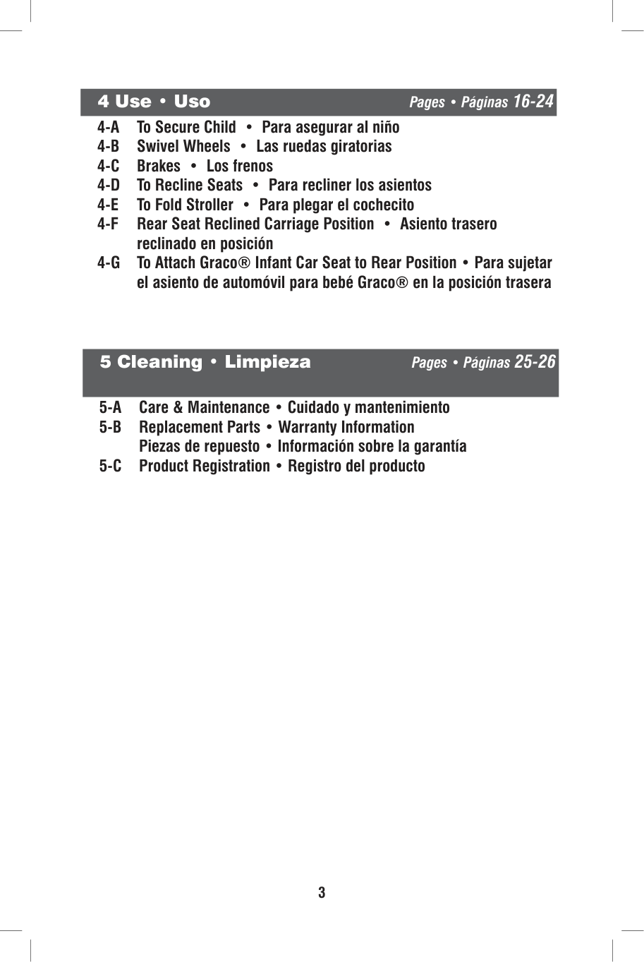 26 In 5-B Replacement Parts • Warranty Information (USA) Piezas de repuesto • Información sobre la garantía (EE.UU.) www.gracobaby.com or/o 1-800-345-4109 5-C Product Registration (USA) Registro del producto (EE.UU.) To purchase parts or accesso- ries or for warranty information in the United States, please contact us at the following: Para comprar piezas o accesorios o para obtener información sobre la garantía en los Estados Unidos, por favor comuníquese con nosotros en: To register your Graco product from within the U.S.A. visit us online at www.gracobaby.com/productregistration or return registration card provided with your product. We currently do not accept product registrations from those living outside the United States of America. Para registrar su producto Graco dentro de los EE.UU., visítenos en línea en www.gracobaby.com/productregistration o envíe la tarjeta de registro provista con su producto. Actualmente no aceptamos registros de los productos de quienes viven fuera de los Estados Unidos de América.