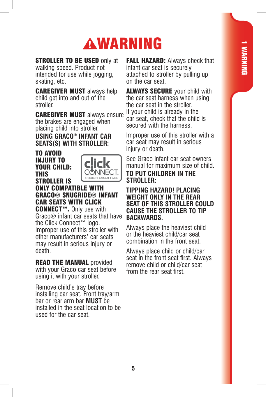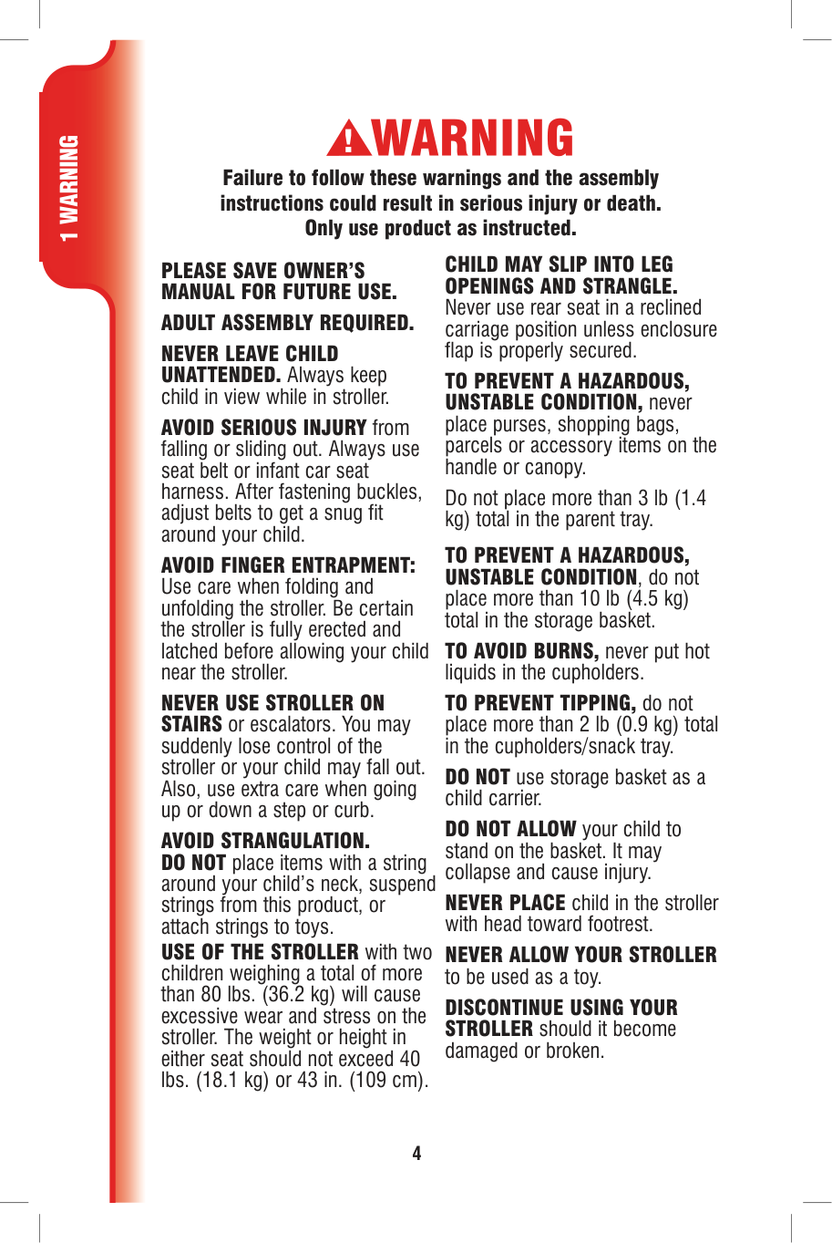 5 STROLLER TO BE USED only at walking speed. Product not intended for use while jogging, skating, etc. CAREGIVER MUST always help child get into and out of the stroller. CAREGIVER MUST always ensure the brakes are engaged when placing child into stroller.