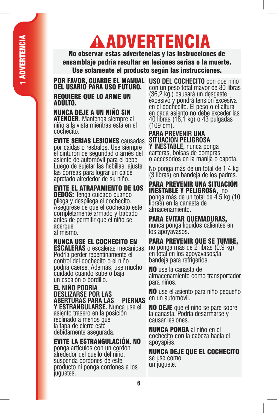 no ponga más de 2 libras (0.9 kg) en total en los apoyavasos/la bandeja para refrigerios. NO use la canasta de almacenamiento como transportador para niños. NO use el asiento para niño pequeño en un automóvil. NO DEJE que el niño se pare sobre la canasta. Podría desarmarse y causar lesiones. NUNCA PONGA al niño en el cochecito con la cabeza hacia el apoyapiés.Nunca Deje Que El Cochecito
