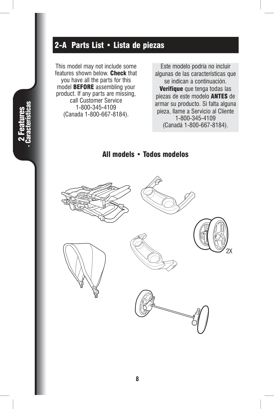 Coloque siempre el niño más pesado o la combinación transportador y niño más pesada en el asiento delantero. Coloque siempre el niño o el transportador y el niño primero en el asiento delantero. Saque siempre al niño o al transportador y al niño primero del asiento trasero.8 2-A Parts List • Lista de piezas All models • Todos modelos This model may not include some features shown below. Check that you have all the parts for this model BEFORE assembling your product. If any parts are missing, call Customer Service 1-800-345-4109 (Canada 1-800-667-8184). Este modelo podría no incluir algunas de las características que se indican a continuación. Verifique que tenga todas las piezas de este modelo ANTES de armar su producto. Si falta alguna pieza, llame a Servicio al Cliente 1-800-345-4109 (Canadá 1-800-667-8184).