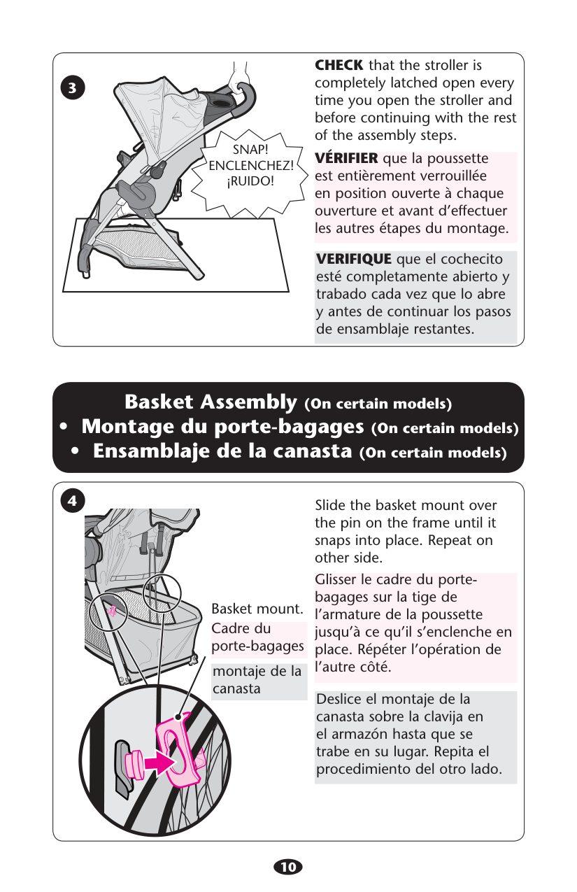 10 CHECK that the stroller is completely latched open every time you open the stroller and before continuing with the rest of the assembly steps. VÉRIFIER que la poussette est entièrement verrouillée en position ouverte à chaque ouverture et avant d’effectuer les autres étapes du montage. VERIFIQUE que el cochecito esté completamente abierto y trabado cada vez que lo abre y antes de continuar los pasos de ensamblaje restantes.