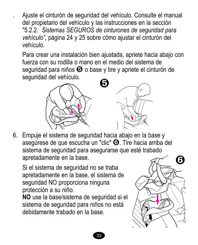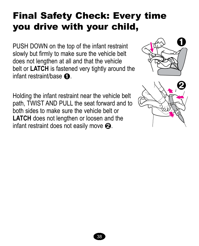 Verificación final de seguridad: Cada vez que sale en el automóvil con su niño, EMPUJE HACIA ABAJO lenta pero firmemente la parte de arriba del sistema de seguridad para niños para asegurarse que el cinturón del vehículo o LATCH esté asegurado apretadamente alrededor de la base/sistema de seguridad para niños . GIRE Y TIRE el asiento hacia adelante agarrando el sistema de seguridad cerca del recorrido del cinturón del vehículo y en ambos costados para asegurarse que el cinturón del vehículo o LATCH no se alargue ni se afloje y que no se pueda mover el sistema de seguridad con facilidad . 38 38 38 38 38 38 38