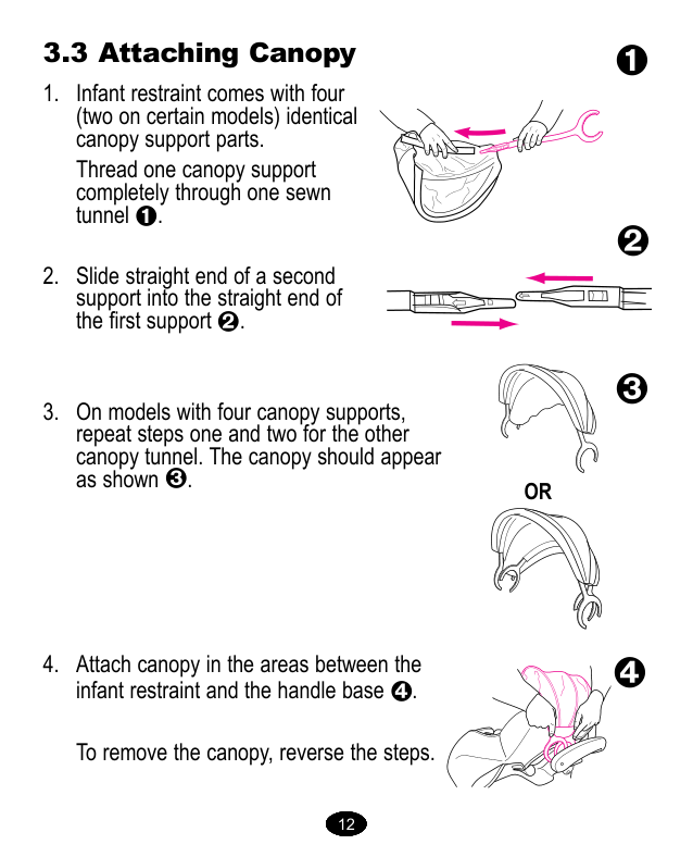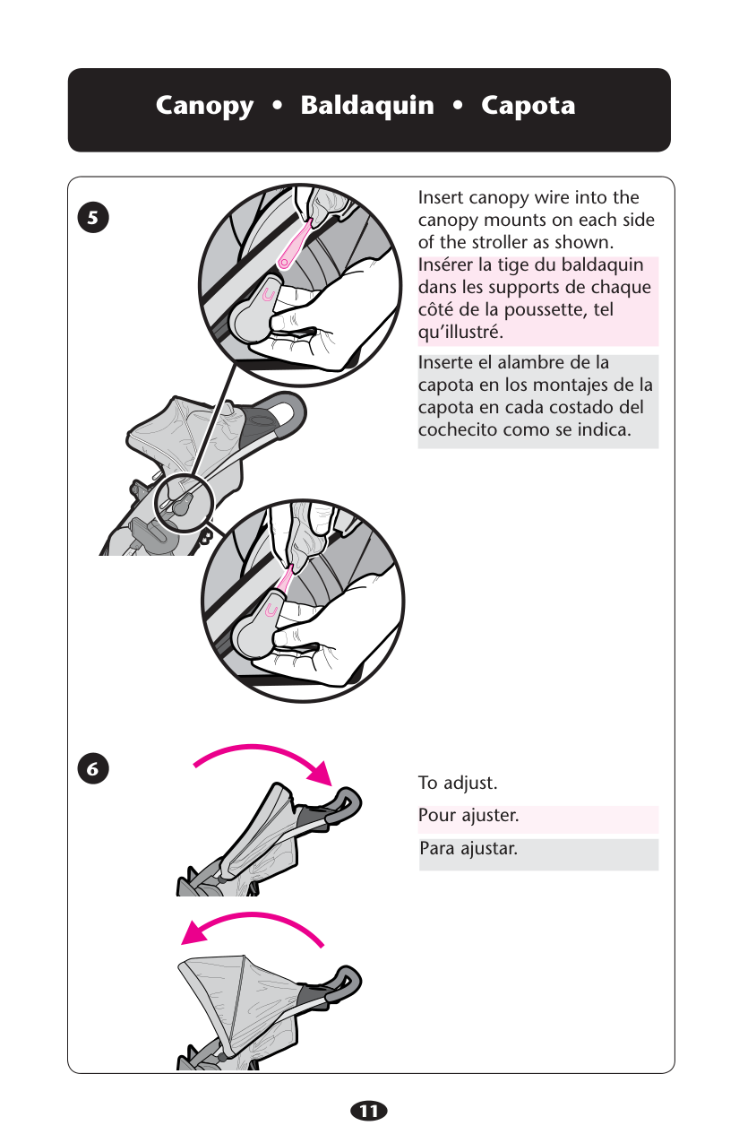 Slide the basket mount over the pin on the frame until it snaps into place. Repeat on other side. Glisser le cadre du porte- bagages sur la tige de l’armature de la poussette jusqu’à ce qu’il s’enclenche en place. Répéter l’opération de l’autre côté. Deslice el montaje de la canasta sobre la clavija en el armazón hasta que se trabe en su lugar. Repita el procedimiento del otro lado. Basket mount. Cadre du porte-bagages montaje de la canasta 3 4 Basket Assembly (On certain models) sMontage du porte-bagages (On certain models) sEnsamblaje de la canasta (On certain models)11 To adjust. Pour ajuster. Para ajustar. 5 Insert canopy wire into the canopy mounts on each side of the stroller as shown. Insérer la tige du baldaquin dans les supports de chaque côté de la poussette, tel qu’illustré. Inserte el alambre de la capota en los montajes de la capota en cada costado del cochecito como se indica. 6 Canopy s Baldaquin sCapota