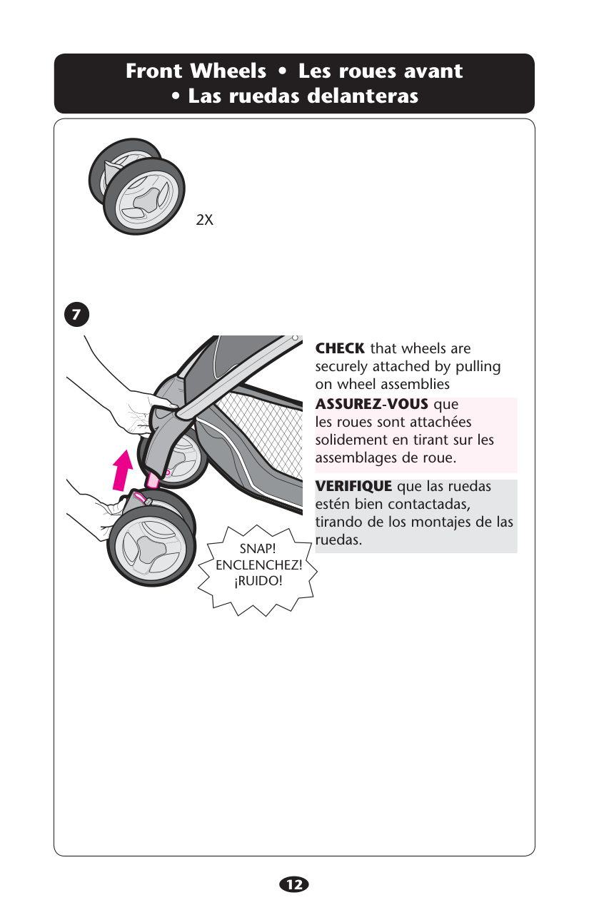 12 &RONT7HEELS s ,ESROUESAVANT s,ASRUEDASDELANTERAS CHECK that wheels are securely attached by pulling on wheel assemblies ASSUREZ-VOUS que les roues sont attachées solidement en tirant sur les assemblages de roue. VERIFIQUE que las ruedas estén bien contactadas, tirando de los montajes de las ruedas.