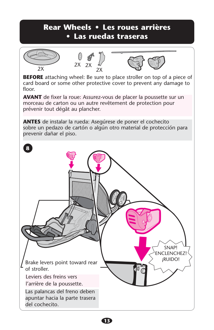 ANTES de instalar la rueda: Asegúrese de poner el cochecito sobre un pedazo de cartón o algún otro material de protección para prevenir dañar el piso. AVANT de fixer la roue: Assurez-vous de placer la poussette sur un morceau de carton ou un autre revêtement de protection pour prévenir tout dégât au plancher. BEFORE attaching wheel: Be sure to place stroller on top of a piece of card board or some other protective cover to prevent any damage to floor. 82X