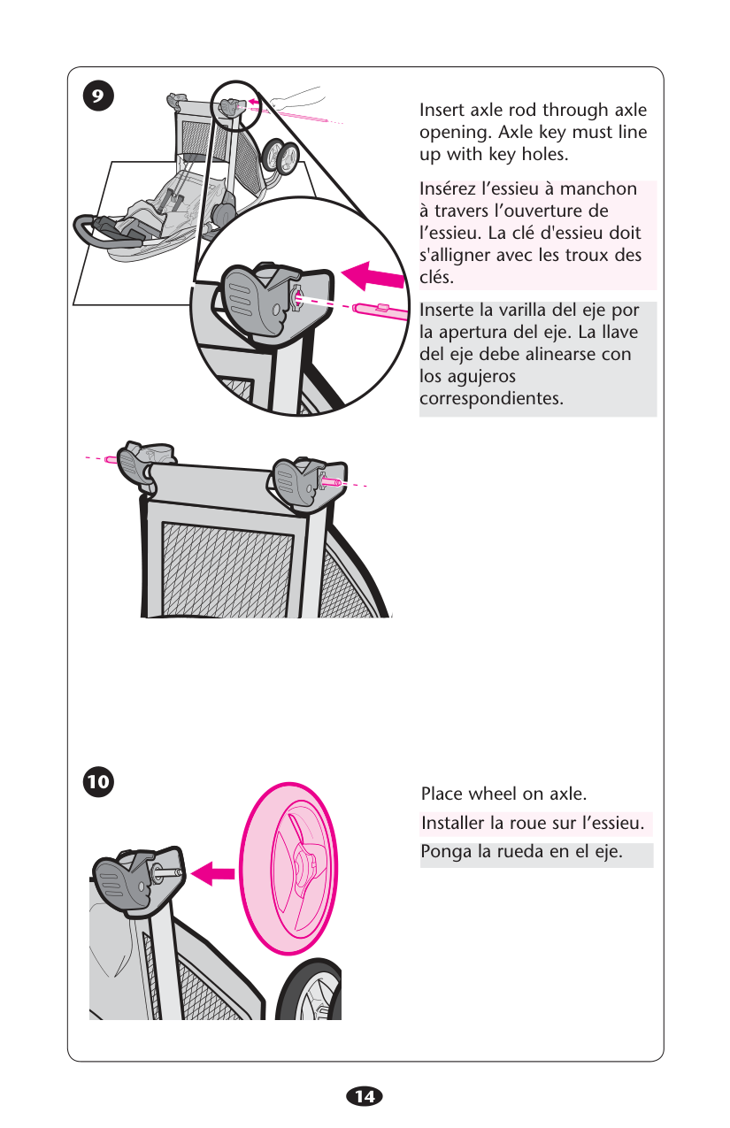 14 10 9 Ponga la rueda en el eje. Place wheel on axle. Installer la roue sur l’essieu. Insérez l’essieu à manchon à travers l’ouverture de l’essieu. La clé d'essieu doit s'alligner avec les troux des clés. Inserte la varilla del eje por la apertura del eje. La llave del eje debe alinearse con los agujeros correspondientes. Insert axle rod through axle opening. Axle key must line up with key holes.